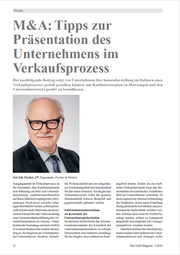 First impressions count – especially in the M&A process. Even before potential buyers examine detailed documents, they form an opinion of the company through its website, public information, and initial company documents. Edy Fischer shows how companies can strategically shape their public image during a sales process to convince potential buyers and positively influence the company's value. This article provides practical advice on what is particularly important when presenting a company to potential investors.